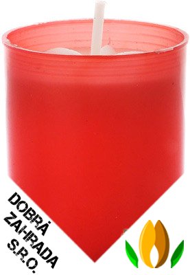Svíčka vzpomínková v plastovém červeném obalu, výška 5cm, baleno po pěti kusech.
